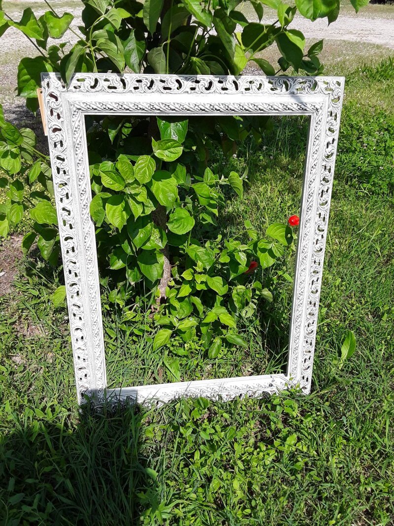 Cornice in legno intagliata, dipinta a mano in stile shabby.