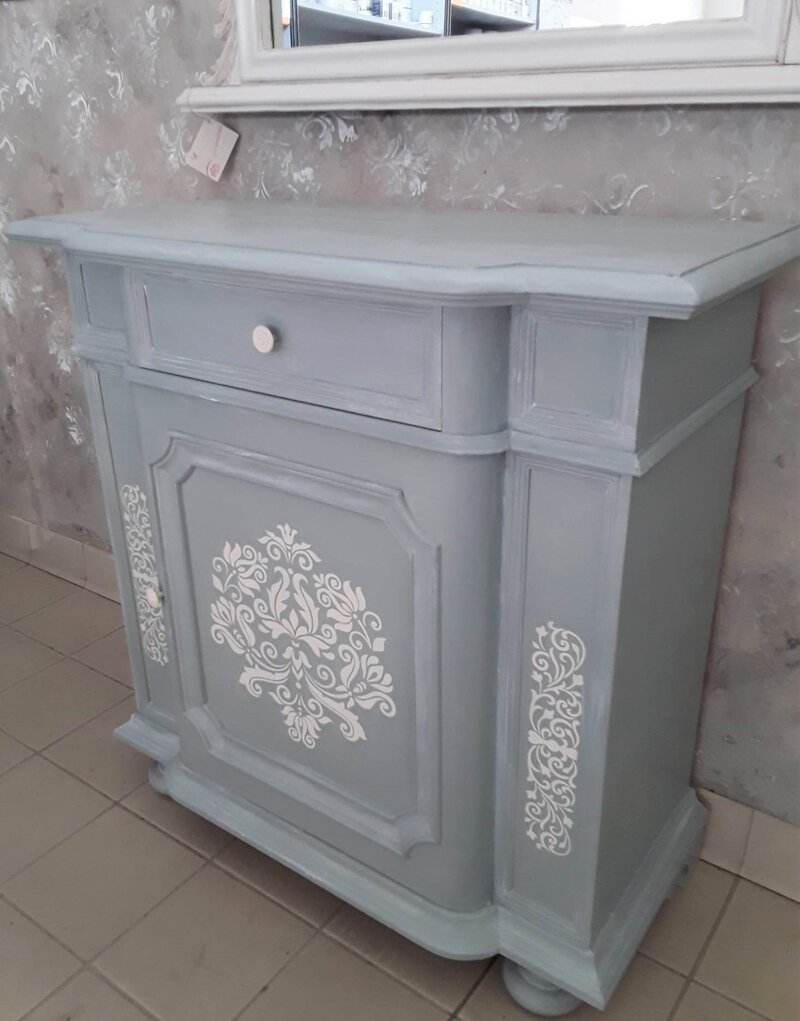 Piccola credenza in legno dipinta e decorata a mano con stencil. Colore petrolio chiaro, interni e decori crema. Misure 84x40 h.83. Pezzo unico. Solo ritiro in sede, no spedizione
