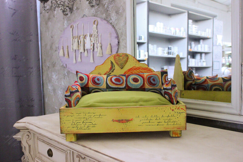 Divanetto in legno realizzato artigianalmente e decorato a mano.