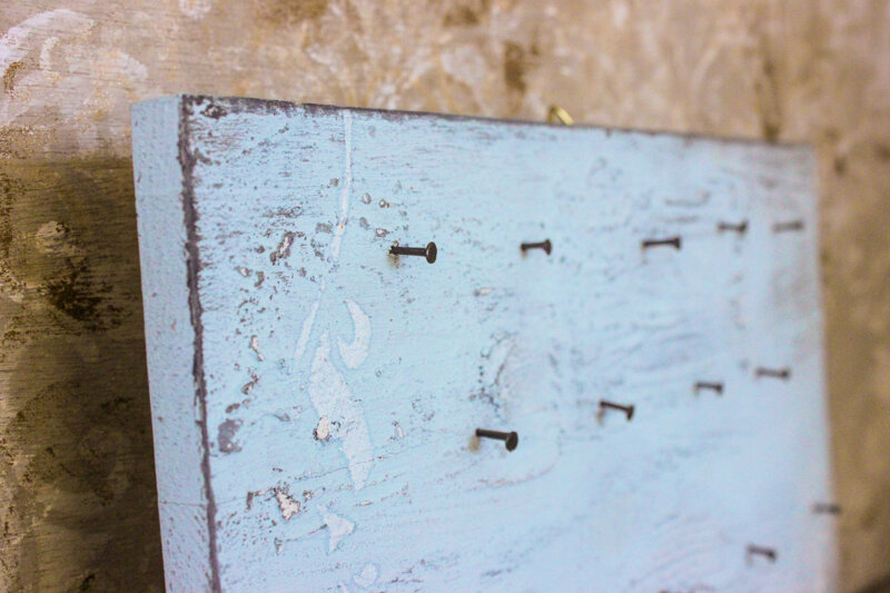 Pannello in legno decorato a mano tecnica materica con chiodini per appendere i tuoi gioielli. Misure 30x19