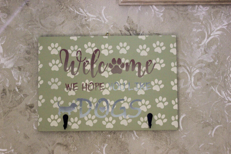 Pannello porta guinzaglio in legno, 2 ganci, decorato a mano.