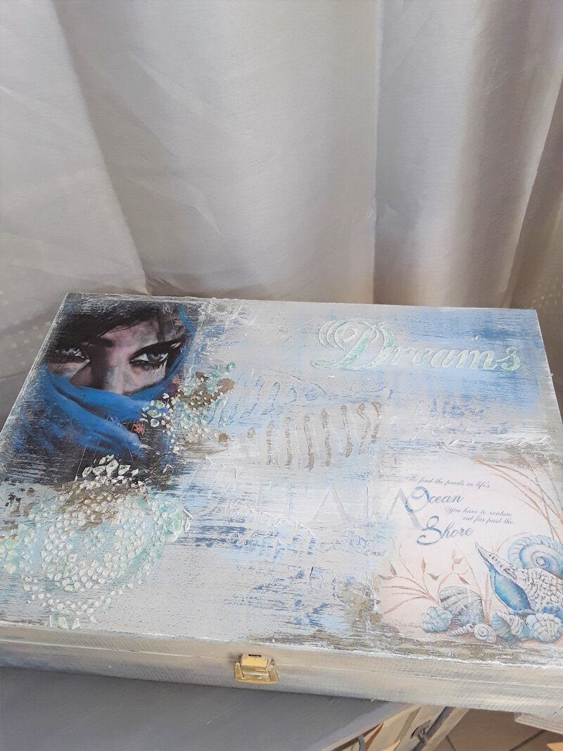 Scatola in legno decorata a mano in stile coastal, stencil materici.