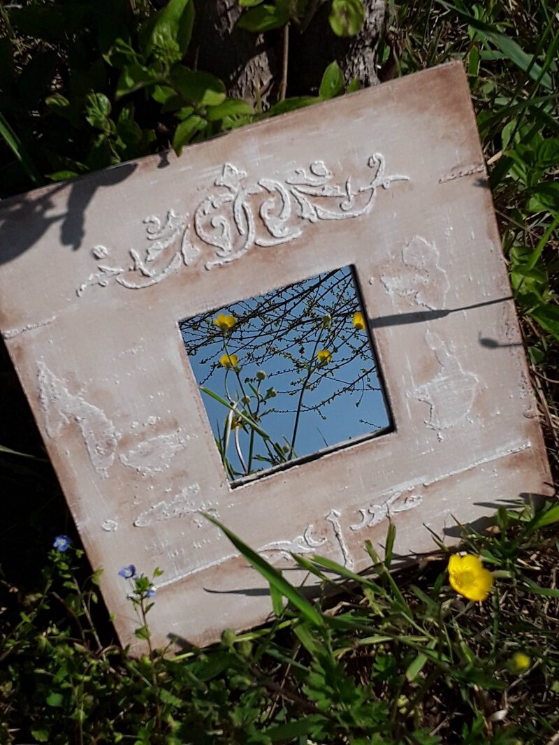 Cornice quadrata con piccolo specchio decorata a mano con tecnica materica. Misure 26x26