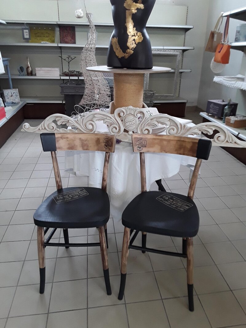 Coppia di sedie vintage in legno naturale, dipinte e decorate a mano.